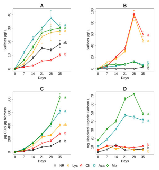 Sulfates (A) and sulfides (B) concentrations, microbial respiration (C) and dissolved organic carbon (D) during 35 days of anaerobic incubation in the five sites (n = 5, mean ± SD). For each site and at the end of each curve, an indicator letter has been added. Different letters (a,b,c,d) between sites indicate significant differences with p < 0.05 in the evolution of the measured parameter over time, obtained by repeated-measures ANOVA at the 5% critical threshold.