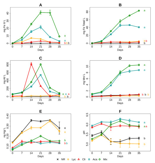 Fe(II) (A), total iron (B), Al (C), Mn (D), Hg (E) concentrations and pH (F) during 35 days of anaerobic incubation in the five sites (n = 5, mean ± SD). For each site and at the end of each curve, an indicator letter has been added. Different letters (a,b,c,d) between sites indicate significant differences with p < 0.05 in the evolution of the measured parameter over time, obtained by repeated-measures ANOVA at the 5% critical threshold.