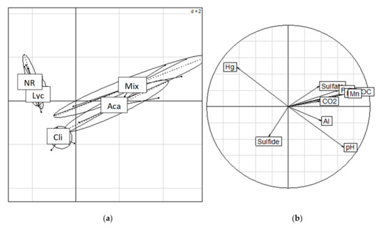 Principal component analysis (PCA) on the data monitored during the anaerobic experiment with types of vegetation cover. Left (a): projection of data set variability plotted on a factorial map of the first two discriminating axes according to respective Labels on the gravity center correspond to the types of vegetation cover: NR. Non-Restored with only spontaneous vegetation, Lyc. Lycopodiella sp, Cli. C. racemosa, Aca. A. mangium, Mix: Mixed fabaceous culture. To sub-factor of respective factor. Right (b): correlation circles plot with variable vectors (pH, CO2, DOC, SO42−, S2−, Fe (II), Fe, Al, Mn, Hg) for each respective factor. Eigen values 54.4% and 17.5% for axes 1 and 2, respectively. Rand test: simulated p-value: 0.001. Explained variance: 47.1%.