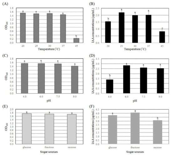 Indole acetic acid (IAA) production was determined as described previously [35], with minor modifications. Bacterial cultures were grown on LB media containing 100 μg mL−1 of tryptophan with different pH levels (pH 4.0, 6.0, 7.5, or 9.0) and appropriate antibiotic for 48 h at selected temperatures (20 °C, 25 °C, 30 °C, 37 °C, or 45 °C). Bacteria were also cultured on M9 salt media (pH 7.5) at 30 °C for 48 h with 100 μg mL−1 of tryptophan and 2% of different kinds of sugar: glucose, fructose, or sucrose. Fully grown bacteria cultures were then centrifuged at 5000 rpm for 10 min, and the supernatant was passed through a syringe filter with a pore size of 0.2 µm (Sartorius, Goettingen, Germany) to remove bacteria. The 500 μL of supernatant was mixed with 1 mL of the Salkowski reagent (50 mL of 36% of H2SO4 and 1 mL 0.5 M FeCl3 solution) and incubated at room temperature for 25 min. Finally, the concentrations of IAA in the supernatants were determined by comparison of the absorbance measured at 530 nm (OD530) with a standard curve of 0–100 µg mL−1 IAA.