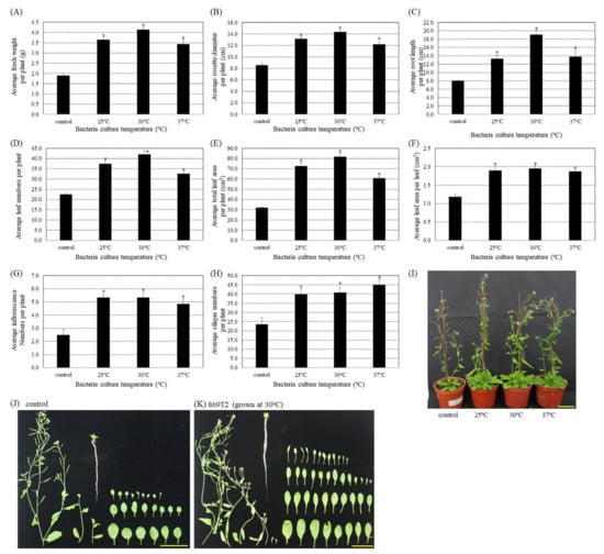 Inoculation of B. seminalis strain 869T2 into Arabidopsis thaliana (ecotype: Columbia) improved various growth parameters compared with mock-inoculated control plants. Strain 869T2 was grown at 25, 30, or 37 °C and then used to inoculate Arabidopsis plants. Two weeks after inoculation, the average values for fresh weight (A), rosette diameter (B), root length (C), leaf numbers per plant (D), total leaf area per plant (E), leaf area per leaf (F), and the numbers of inflorescences (G), and siliques (H) per plant were determined for the inoculated and control plants. Data are mean ± SE (standard error) from at least three independent bacteria inoculation experiments. More than 20 individual plants were examined for each bacteria inoculation assay. * p < 0.05 compared with the control plants by pairwise Student t-tests. (I), photographs of the mock-inoculated control Arabidopsis plant and the plants inoculated with strain 869T2 cultured at 25 °C, 30 °C, or 37 °C. Photographs of total leaves, inflorescences, and roots of the control (J) and the 869T2-inoculated plants (K). Yellow bar = 5 cm.