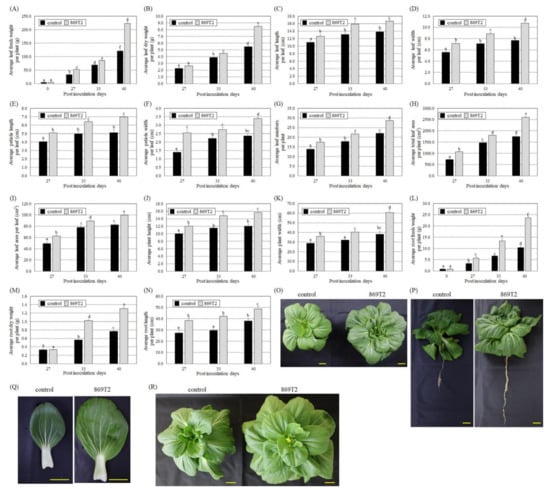 B. seminalis strain 869T2 enhanced the growth of ching chiang pak choi (Brassica chinensis) plants. At 27, 33, and 40 days after inoculation with strain 869T2, the average values for leaf fresh weight (A) and leaf dry weight (B) per plant, leaf length (C), leaf width (D), petiole length (E), petiole width (F), number of leaves (G), total leaf area (H) per plant, leaf area per leaf (I), plant height (J), plant width (K), root fresh weight (L), root dry weight (M), and root length (N) were recorded for the control and inoculated plants. Data are mean ± SE (standard error) from at least three independent bacteria inoculation experiments. More than 20 individual plants were examined for each bacteria inoculation assay. Data were analyzed using Duncan tests and means with different letters were significantly different (p < 0.05). Panels (O–Q): top-view (O), side-view (P), and single leaf (Q) photographs of the mock-inoculated control and the 869T2-inoculated plants at 40 days after inoculation. top-view photographs of the control and 869T2-inoculated plants 53 days after inoculation (R). Yellow bar = 5 cm.