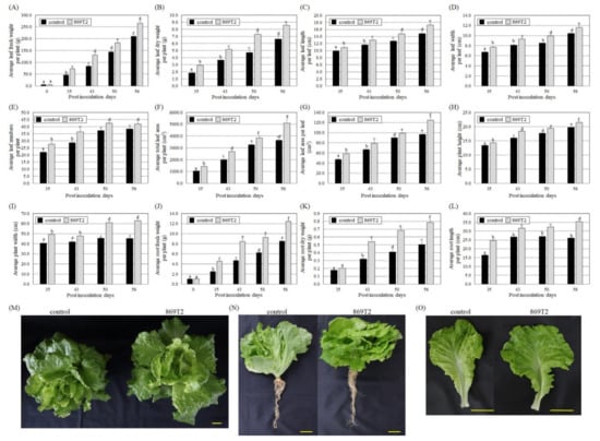 Loose-leaf lettuce (Lactuca sativa L.) plants were larger and heavier after inoculation with B. seminalis strain 869T2. At 35, 43, 50, and 56 days after inoculation, the average values for leaf fresh weight (A), leaf dry weight (B), leaf length (C), leaf width (D), number of leaves (E), total leaf area per plant (F), leaf area per leaf (G), plant height (H), plant width (I), root fresh weight (J), root dry weight (K), and root length (L) were examined for the control and inoculated plants. Data are mean ± SE (standard error) from at least three independent bacteria inoculation experiments. More than 20 individual plants were examined for each bacteria inoculation assay. Data were analyzed using Duncan tests and means with different letters were significantly different (p < 0.05). Panels (M–O): top-view (M), side-view (N), and single leaf (O) photographs of the control and 869T2-inoculated plants 56 days after inoculation. Yellow bar = 5 cm.