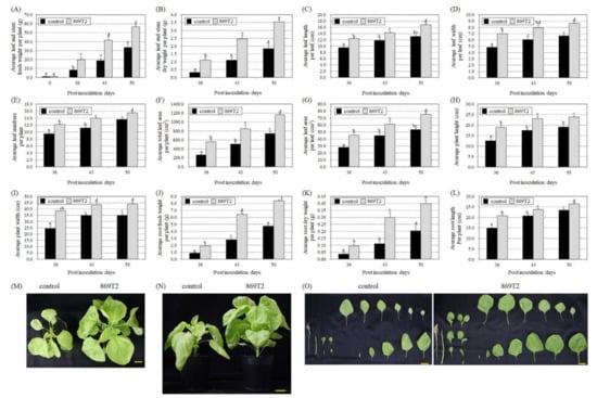 Inoculation of Chinese amaranth (Amaranthus tricolor) plants with B. seminalis strain 869T2 promoted growth of both aboveground and belowground parts after inoculation. At 36, 43, and 50 days after inoculation, the average values of leaf and stem fresh weight per plant (A), leaf and stem dry weight per plant (B), leaf length (C), leaf width (D), number of leaves (E), total leaf area per plant (F), leaf area per leaf (G), plant height (H), plant width (I), root fresh weight (J), root dry weight (K), and root length (L) of the control and inoculated plants were documented. Data are mean ± SE (standard error) from at least three independent bacteria inoculation experiments. More than 20 individual plants were examined for each bacteria inoculation assay. Data were analyzed using Duncan tests and means with different letters were significantly different (p < 0.05). Panels (M–O): photographs of the top-view (M), side-view (N), and the whole plant (O) for the control and 869T2-inoculated plants 43 days after inoculation. Yellow bar = 5 cm.