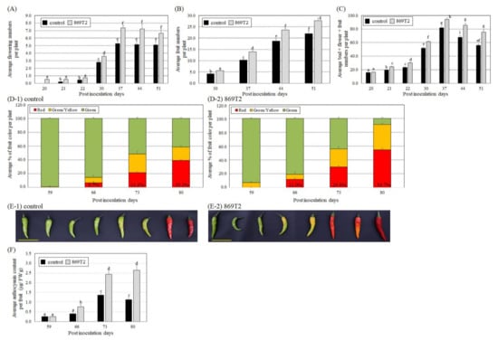 B. seminalis strain 869T2 inoculation caused hot pepper (Capsicum annuum) plants to have more flowers and fruits. The average values for the number of flowers (A), number of fruits (B), number of buds + flowers + fruits (C), and percentage of fruits of a given color (D) per plant were recorded for the control and inoculated plants after inoculation. Panel (E) shows photographs of fruits from the control (E-1) and inoculated (E-2) plants 73 days after inoculation. Yellow bar = 5 cm. After inoculation, the average anthocyanin content per fruit (F) was determined for the control and the 869T2-inoculated plants. Data are mean ± SE (standard error) from at least three independent bacteria inoculation experiments. More than 20 individual plants were examined for each bacteria inoculation assay. Duncan tests were used to analyze the data, and means with different letters were significantly different (p < 0.05).