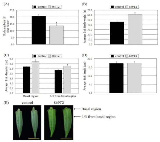 After inoculation with B. seminalis strain 869T2, okra (Abelmoschus esculentus) plants had heavier and wider fruits than control plants. The average values for the number of nodes of the first flower (A), fruit fresh weight (B), fruit diameter (C), and fruit length (D) were determined for the control and inoculated plants after inoculation. Data are mean ± SE (standard error) from at least three independent bacteria inoculation experiments. More than 20 individual plants were examined for each bacteria inoculation assay. * p < 0.05 compared with the control plants by pairwise Student t-tests. Panel (E) shows photographs of the fruits from the control and the inoculated okra plants. Yellow bar = 5 cm.