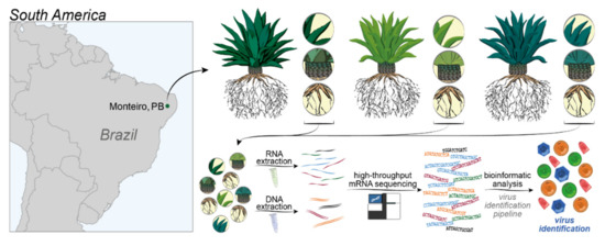 Strategy applied to uncover the virome of Agave species. The dot in the map indicates the localization of Monteiro, in the state of Paraíba. Agave fourcroydes, Agave sisalana and Agave Hybrid 11648 (and their respective organ samples) are indicated in different tones of green, for differentiation purposes. The following methods are indicated in the lower portion of the figure; RNA extraction, DNA extraction, high-throughput sequencing in the Illumina platform, and bioinformatics analysis (see further details in the Material and Methods section).