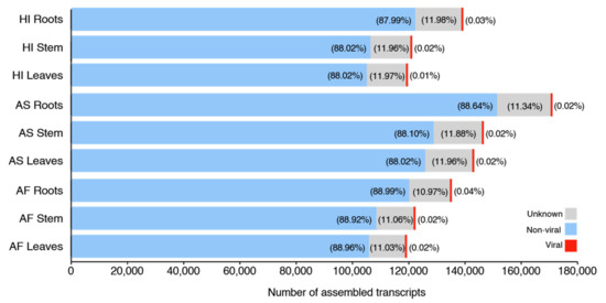 In this study, we took advantage of RNA deep sequencing to identify and characterize the virome of Agave taxa. We deep sequenced 27 RNA libraries from two plant species, and a hybrid variety (three plant taxa × three organs × three replicates for leaf, stem, and root tissues), totalizing 559,267,611 raw reads (Table S2). Transcriptome assemblies produced 251,953 contigs, considering all libraries. Sequence similarity searches revealed that the percentage of viral sequences (not considering contig extension with CAP3) represented ~0.02% of all transcripts assembled for almost all the organs and varieties, with exception of the roots of Agave fourcroydes (0.04%) and Agave Hybrid 11648 (0.03%) and the leaves of Agave Hybrid 11648 (0.01%) (Figure 2). From the total, 10 contigs showed similarity with viruses at the nucleotide level (Tables S3 and S4), and 80 contigs (extended with CAP3) showed similarity with viral sequences at amino acid level, compared against NCBI sequence databases NT and NR, respectively (Tables S3 and S5). These initial 90 viral contigs identified by sequence similarity suggested the presence of 28 viral species associated with the sisal samples, including one known species (CPMMV) and 27 new viral species, which were assigned to at least seven viral families; Alphaflexiviridae (three species, four contigs), Betaflexiviridae (seven species, 22 contigs), Botourmiaviridae (two species, two contigs), Closteroviridae (one species, eight contigs), Mitoviridae (one species, five contigs), Partitiviridae (one species, one contig), Virgaviridae (three species, 19 contigs), and Unclassified species including Unclassified dsRNA (four species, 12 contigs), Unclassified Riboviria (one species, two contigs), or simply Unclassified (four species, 13 contigs). Details about sequence similarity searches can be visualized in Table S5.
