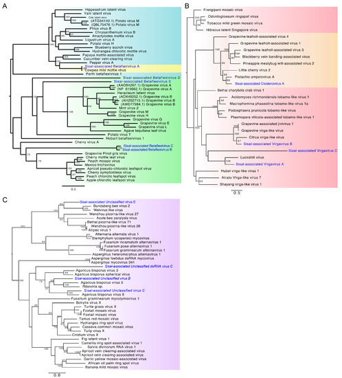 In order to further assess the phylogenetic relationship between Agave-associated viruses and related species in public reference databases, we selected all the species belonging to Classes 2–4 to perform phylogeny, which included 13 putative viral species (Figure 3A–C). Among these 13 species, five were assigned to the family Betaflexiviridae (Figure 3A): Sisal-associated Betaflexivirus A (phylogenetically closer to Cowpea mild mottle virus, a broad-host-range plant-infecting species also found in our samples); Sisal-associated Betaflexivirus B and Sisal-associated Betaflexivirus C formed a separate clade, phylogenetically closer to a clade including the Grapevine Pinot gris virus and others, all of which characterized as plant-infecting species; Sisal-associated Betaflexivirus E was closer to a clade including the Agave tequilana leaf virus (virus identified in a species related to the Agave species investigated in our study), Heracleum latent virus, and seven other viral species infecting grapevine. Three viral species were assigned to the family Virgaviridae (Figure 3B): Sisal-associated virgavirus A was closer to Luckshill virus, a virus found in Drosophila suzukii, according to Medd et al. (2018) [49]; Sisal-associated Virgavirus B (closer to two grapevine viruses), and Sisal-associated Virgavirus C (closer to oomycete-infecting viruses and mycoviruses). Three species were designed to clades containing viruses described solely as ‘Unclassified’, besides one Unclassified dsRNA virus (Figure 3C): Sisal-associated Unclassified virus B, Sisal-associated Unclassified virus C, Sisal-associated Unclassified virus E, and Sisal-associated Unclassified dsRNA virus C. The family Closteroviridae were represented by one species (Figure 3B): Sisal-associated Closterovirus A. Usually, viral species were assigned to the same family of its closest related virus identified by sequence similarity searches, except for Sisal-associated Virgavirus B, which was initially described as unclassified, but further phylogenetic analysis indicates it is an element from the Virgaviridae family, similarly to Sisal-associated Unclassified dsRNA virus, initially only classified as Riboviria. After performing the phylogeny, based on phylogenetic relationships and sequence similarity results we settled the identity and named our 24 putative new viral species, as described in Table 1. We also constructed a phylogenetic tree to analyze the obtained CPMMV isolate, which is available in Figure S4. Interesting, we observed the CPMMV identified in Agave species is closely related to other isolates identified in Brazilian samples. Furthermore, we observed a great number of CPMMV isolates derived from different species, indicating the broad range of hosts that the virus can infect. The accession codes for other viral sequences are available in Table S8.