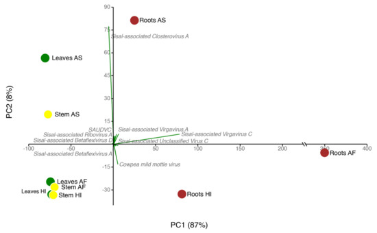 The quantification metrics for selected viral contigs (in tpm—transcripts per million) were obtained from kallitsto [32]. The resulting expression matrix was analyzed with the packages vegan and vegetarian from R [47], while PCA analysis and diversity indices were produced with PAST [48] using as variables the viral expression of our 25 species on the three analyzed organs (leaves, stems, and roots) for each of the three Agave taxa. For the PCA analysis, quantitative data from kallisto were used, while for the diversity indices, a presence-absence matrix was generated.