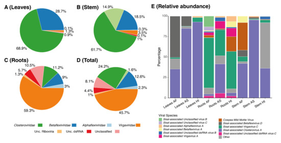 Viral abundance of Agave-associated viruses by organ. Pie charts indicate viral family abundance by expression in tpm, in (A): leaves, (B): stems, (C): roots, and (D): in total. Values are summed for all plants. (E): The stacked bar plot indicates the relative abundance of the top 12 expressed viral species in each organ.