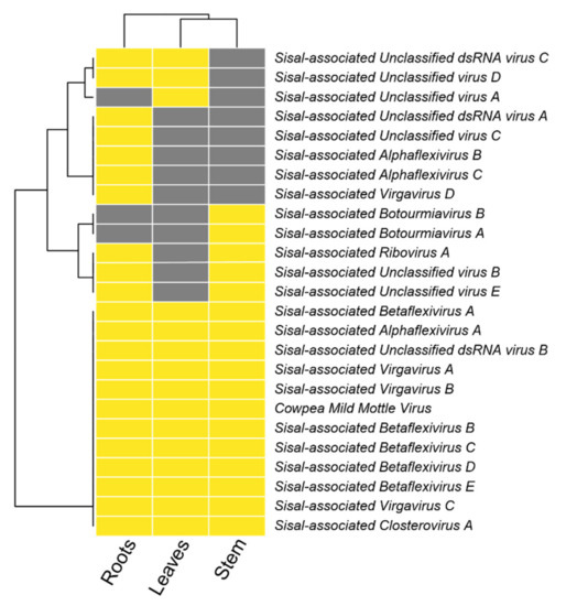 Organ tropism of Agave-infecting viruses. Colors indicate the presence (yellow) or absence (grey) of viral species over plant organs.