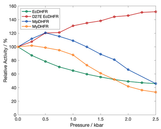 One adaptation in MpDHFR that might appear to be for pressure is the presence of Glu27 rather than Asp27 in EcDHFR. With increasing pressure, the Asp27Glu mutation (D27E) of EcDHFR exhibits increased activity, rather than the decreased activity observed in wild-type EcDHFR (Figure 1) [36]. However, enzyme activity does not always increase with pressure for DHFR from other deep-sea bacteria [36]. Since many of the piezophile proteins studied have been from microbes from the cold deep ocean, the adaptations may be for cold temperature rather than for high pressure [37]. Recently, a combined experimental and simulation study comparing adenylate kinase (Adk) from E. coli and Photobacterium profundum SS9, a piezophile, also identified specific residue adaptations that make EcAdk more active under pressure [38]. However, since P. profundum is a deep-sea microbe with optimal TG = 15 °C and PG = 280 bar [39], it is also not clear if the adaptation was for high pressure or cold temperature.
