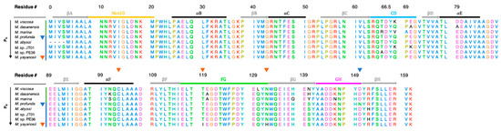 Sequence alignment of Moritella DHFRs sorted from lowest to highest PG. Unique residues are indicated by triangles for MpDHFR (blue), and MyDHFR (yellow). Secondary structure elements are indicated by horizontal bars: α-helices (gray), β-strands (black) and the Met20 (yellow), CD (blue), FG (green) and GH (magenta) loops. M. japonica DHFR left out due to low sequence identity (28.85%) to MpDHFR. Sequence numbering is based on E. coli DHFR, with the insertion in Moritella DHFRs between residues 65 and 66 of E. coli DHFR denoted as 66.5.