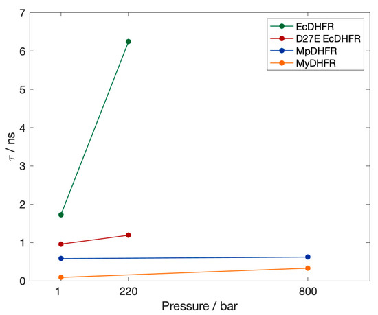 For proteins, the effects of pressure are compression and denaturation [22]. At pressures below 4 kbar, compression dominates, while at pressures well above 4 kbar, denaturation can occur. One of the most experimentally studied enzymes for both structure and activity under pressure is the ubiquitous enzyme, DHFR, which reduces dihydrofolate (DHF) to tetrahydrofolate (THF). DHFR from Escherichia coli (Ec) is well-characterized experimentally under mesophilic conditions. Structures of EcDHFR at 1 bar bound with different combinations of the oxidized/reduced co-factor nicotinamide adenine dinucleotide phosphate (NADP+/NADPH), and DHF, THF, or analogs have contributed to a detailed picture of the molecular mechanism of DHFR [27]. For instance, conformational changes between “occluded”, “closed”, and “open” conformations of the Met20 loop at the nicotinamide binding site have been implicated in the catalytic activity [28,29]. Interestingly, although only the occluded conformation is seen in THF-bound DHFR by NMR at 1 bar, a high-pressure 15N/1H two-dimensional NMR study has demonstrated the appearance of a second conformation as pressure is increased up to 2 kbar [30]. In addition, crystal structures of EcDHFR at pressures up to 8 kbar [31] indicate that transient open conformations appear important for nicotinamide to enter its binding pocket.