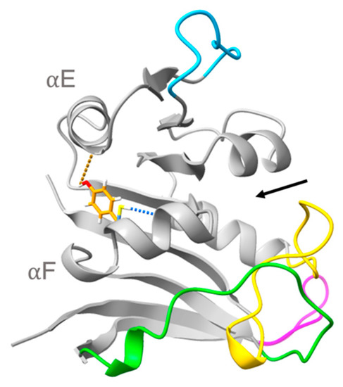 Superimposed structures of M. profunda and M. yayanosii dihydrofolate reductase highlighting Cys103 Sγ…Ile99 O in MpDHFR (blue) and Tyr103 Oη…Leu78 O in MyDHFR (orange) hydrogen bonds (denoted with dashed blue lines). Ligand binding pocket denoted by black arrow.
