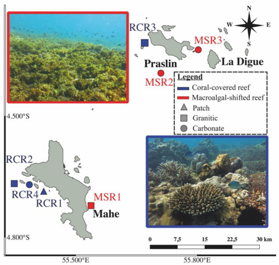 Sampling map of coral-dominated reefs (RCR1: RCR4 in blue) and macroalgae shifted reefs (MSR1: MSR3 in red) with their respective geomorphology (patch, carbonate or granitic). The pictures of coral-covered and macroalgae shifted reefs are represented respectively in blue squared (bottom right) and in red squared (top left). Photo credits: Nicholas A.J. Graham.