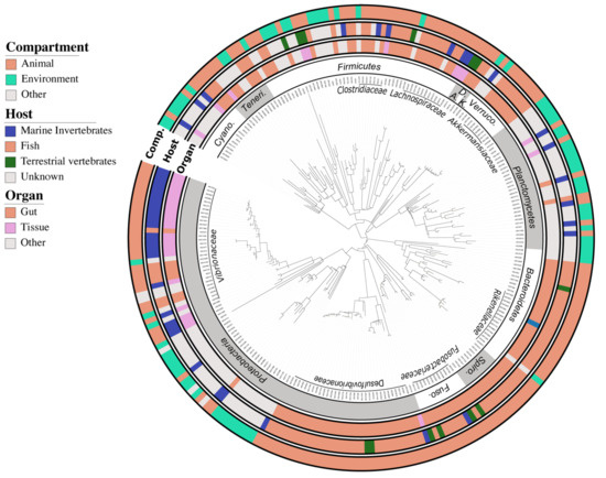 Maximum parsimony phylogenetic tree of the 254 ASVs from the fish gut core bacteriome. The 16S rRNA sequences were inserted into the original SILVA (release 138.1) tree using parsimony criteria with the Bacteria filter excluding highly variable positions. The inner ring represents the order level nomenclature following the taxonomy provided by default in the SILVA bacterial tree. The three outer rings depict the habitat preferences of each ASV described here as three categories (i.e., habitat, specific host, and organ) clustered from the environmental information associated with each closest blast. The tree was drawn using the web-based interface interactive tree of life (iTOL). Abbreviations: Cyano. = Cyanobacteria; Teneri. = Tenericutes; A. = Actinobacteria; D. = Deferribacteres; K. = Kiritimatiellaeota; Verruco. = Verrucomicrobia; Spiro. = Spirochaetes; Fuso. = Fusobacteria.