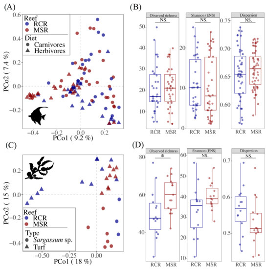 However, the reef condition neither appeared as a significant driver of variability, nor of bacteriome diversity between fish individuals (Figure 3B). Similarly, the ordination of macroalgae bacteriomes in a PCoA showed a clear separation between CCR and RCR (Figure 3C) which explained 7% of the variance in the community composition for macroalgae bacteriomes (Table 1). In addition, richness of macroalgae bacteriomes were 80% higher in MSR (Figure 3D). For fishes, diet was one of the main drivers of gut bacteriome composition as indicated by a PERMANOVA analysis (Table 1, Figure 3A). The gut bacteriome of herbivores (i.e., grazers, scrapers, browsers, and the two omnivorous Cantherines pardalis) was characterized by the enrichment of 12 biomarkers, genera belonging mainly to the Desulfovibrionales, Bacteroidales, and Fusobacteriales, while eight genera belonging mainly to the Clostridiales and Vibrionales appeared as biomarkers for carnivores (i.e., invertivores and piscivores) (Figure S6B).