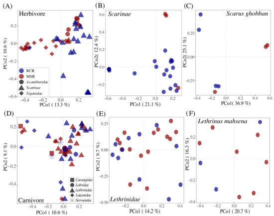 Principal coordinates analysis (PCoA) plots illustrating Bray-Curtis distances between pairs of bacteriome for (A) herbivorous fishes, (B) Scarinae, (C) S.ghobban, (D) carnivorous fishes, (E) Lethrinidae, and (F) L. mahsena. Bacteriomes are colored according to the reef condition: RCR in blue and MSR in red. See Figure S6 for the Lutjanidae, A. virescens, and L. enigmaticus results.