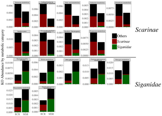 Abundance of each Kegg Ortholog (KO) merged by metabolic pathway, related to enteric bacteriomes of Scarinae (red), Siganidae (green), and other fish families (black) (delineated using a LEfSe approach) in RCR and MSR.