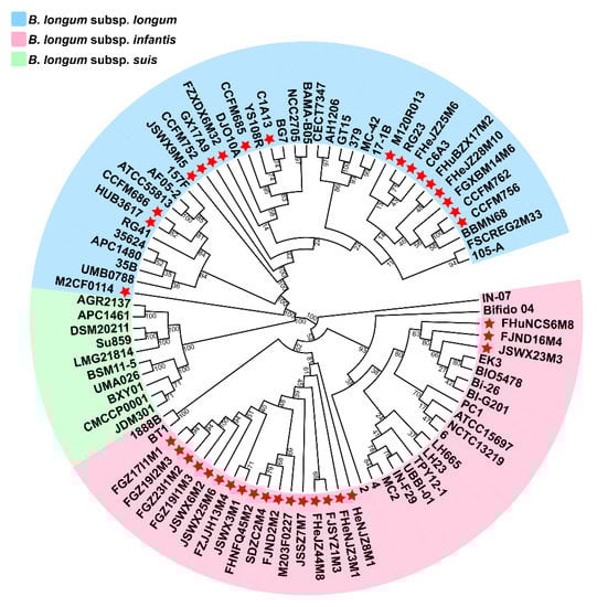 - Mattarelli, P.; Bonaparte, C.; Pot, B.; Biavati, B. Proposal to reclassify the three biotypes of Bifidobacterium longum as three subspecies: Bifidobacterium longum subsp. longum subsp. nov., Bifidobacterium longum subsp. infantis comb. nov. and Bifidobacterium longum subsp. suis comb. nov. Int. J. Syst. Evol. Microbiol. 2008, 58, 767–772. [Google Scholar] [CrossRef] [PubMed] [Green Version]