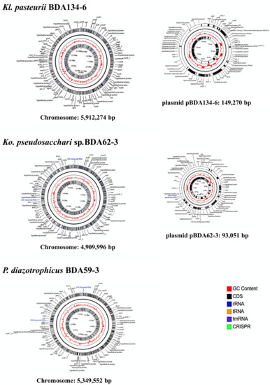 Circular maps of the genomes of Kl. pasteurii BDA134-6, Ko pseudosacchari BDA62-3 and P. diazotrophicus BDA59-3 showing the inner GC content and annotation. Maps were obtained from the CGView Server (http://cgview.ca/, https://doi.org/10.1093/bib/bbx081, accessed on 1 April 2021).