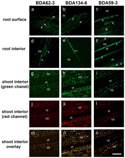 The observations showed that the cells of all bacteria strains were attached along the whole root surface, mostly at random distribution, displaying no preferred site for the external colonization (Figure 3a–c). Internal colonization of root hairs was also detected (Figure 3a–c). Inner colonization of root hair cells did not occur frequently and only a low proportion was internally colonized. From epidermal cells, bacteria were always detected in the intercellular spaces of the root cortex and vascular tissues, never inside cortical cells or invading the interior of the vascular tissue for the three analysed strains (Figure 3d–f). No significant changes were observed during the bioassay for all the rice plants analysed. It is worth mentioning that the tagged bacteria Ko. pseudosacchari BDA62-3, Kl. pasteurii BDA134-6 and P. diazotrophicus BDA59-3 were never detected in the shoots (Figure 3g–o).