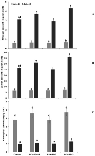 On the other hand, for plants inoculated with Kl. pasteurii BDA134-6, the level of N and C content increased only at 40 DAI. We hypothesize that for the strain Kl. pasteurii BDA134-6 the transfer of fixed N to the host plant occurs in a later phase of plant growth as compared to P. diazotrophicus BDA59-3.