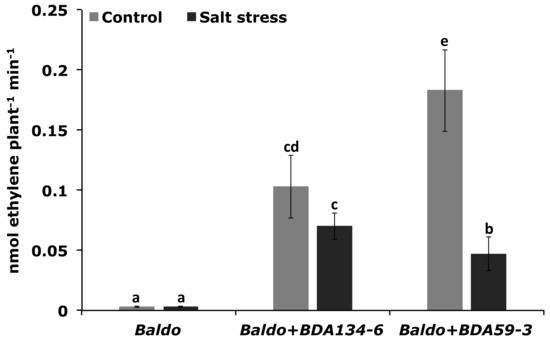 To apply salt stress, three-week-old plants were carefully removed from the pots and the roots rinsed with water. Plants were then transferred into 20 mL glass tubes airtight with serum cap containing 2 mL of minimal medium supplemented with NaCl at a final concentration of 0.3 M and free of nitrogen sources. Plants were then incubated in greenhouse for 20 h and analysed for the ARA test as described by Defez et al. [18]. After the ARA test, plant tissues (roots and leaves) were immediately collected, frozen in liquid nitrogen and stored at −80 °C for further analyses.