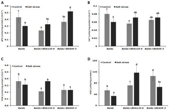 Finally, considering that rice is one of the most salt-sensitive cereals and that the anti-oxidative enzymes scavenge ROS produced as metabolic by-products during osmotic stress and convert them into non-reactive form, the activity of the enzymes APX, CAT, POX and SOD was measured for ‘Baldo’ plants inoculated with Kl. pasteurii BDA134-6 and P. diazotrophicus BDA59-3 under salt stress conditions.