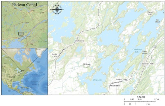 Map of Dog Lake, South Frontenac County, ON, Canada. The Rideau Canal watershed is shown in the top left while Eastern North America is shown in the bottom left. Dog Lake’s center basin is located at 44.435449° N, 76.345772° W.