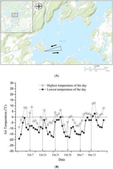 Site sampling information. (A) Site map of Gilmour Point, Dog Lake, South Frontenac County, Ontario (44.435635° N, 76.345549° W). Sampling occurred along two transects, with each site roughly equidistant from the origin point with 5–8 samples collected per transect (Supplementary Table S1). (B) Ambient temperature at each sampling time. The arrows point at sampling dates. Data were obtained from a Acurite 02064M Pro weather station (Chaney Instrument Co, Lake Geneva, WI, USA) set up in accordance with manufacturer’s specifications at Maple Hill, South Frontenac County, Ontario, Canada (44.398594° N, 76.352457° W).