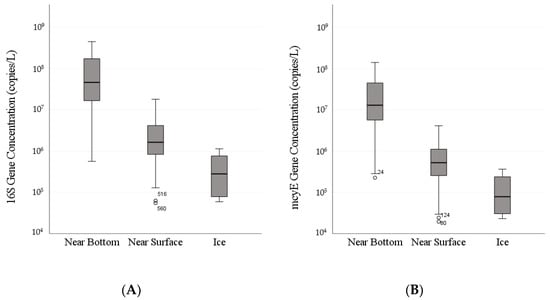 Concentrations of M. aeruginosa 16S rRNA (A) and mcyE (B) gene copies in the near-bottom, near-surface, and ice cover from 7 February to 12 March 2019, at the Gilmour Point, Dog Lake field site. Boxes represent the first to third quartile while whiskers represent 95% confidence intervals. Lines within boxes represent the median. Dots represent outliers.