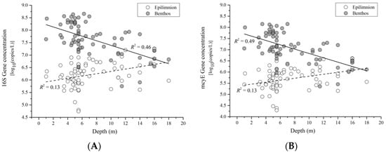 Our post hoc Pearson correlation analysis revealed that there was a significant positive correlation between near-surface M. aeruginosa 16S gene concentration and depth (R2 = 0.13, p = 0.002, N = 69), while a significant negative correlation was found between near-bottom M. aeruginosa 16S gene concentration and depth (R2 = 0.46, p < 0.001, n = 69; Figure 4A). Similar correlation patterns were also found between near-surface mcyE gene concentration and depth (positive correlation, R2 = 0.13, p = 0.002, n = 69) and near-bottom mcyE gene concentration and depth (negative correlation, R2 = 0.49, p < 0.001, n = 69; Figure 4B).