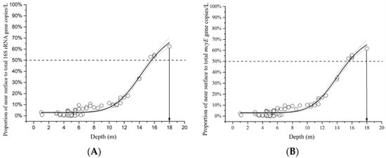Ratio of near-surface to total M. aeruginosa 16S rRNA (A) and mcyE (B) concentration in gene copies per liter plotted against lakebed depth in meters near the Gilmour Point, Dog Lake field site. Ratio was calculated using raw data of concentrations of M. aeruginosa (A) 16S rRNA and (B) mcyE gene concentrations (copies/L) at each sampling site. Dark solid line shows best logistic fitting and its 95% confidence intervals (gray solid lines). R216S = 0.97, R2mcyE = 0.98. Graphed log10 transformed data is on Supplementary Figure S1.
