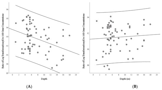 Finally, we created a simple linear regression model that predicted the ratio of the log10 transformed mcyE gene to log10 transformed 16S rRNA gene in the near-bottom. Lakebed depth significantly predicted the mcyE to 16S rRNA gene ratio with a negative coefficient, β = −0.359, F(66) = 9.758, p = 0.003, R2 = 0.129 (Figure 6A). We also did this for the near-surface. Lakebed depth did not significantly predict the transformed mcyE to 16S rRNA gene concentration near the top of the water column, β = 0.071, F(66) = 0.335, p = 0.564, R2 = 0.005 (Figure 6B).