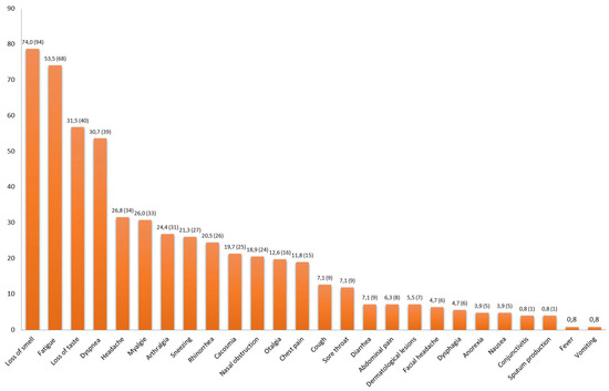 | Duration of symptoms of SARS-CoV-2 infection (days) (mean, extremes, SD) | 29.7 (1–283) ± 42.1 | 57.1 (0–335) ± 82.1 | 39.1 (0–335) ± 60.2 | <0.001 | ||