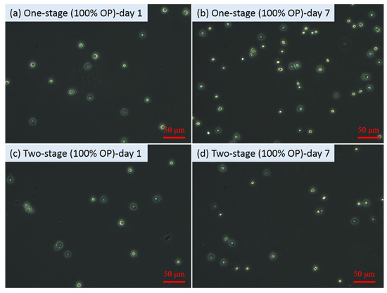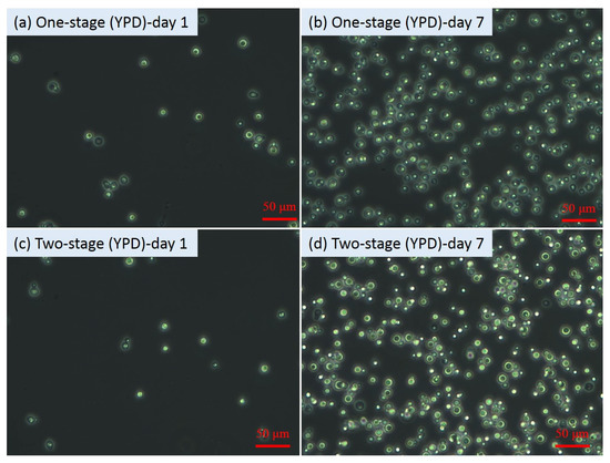 From Figure 1a, after re-suspension at day 6, the OD600 values of all the second-stage fermentation flasks decreased compared to those before re-suspension, which might be mainly attributed to the lighter colour of the sugar solution than the original fermentation media. However, after one day of second-stage fermentation, the OD600 values increased significantly (p values < 0.05) from 1.53 ± 0.01 to 2.13 ± 0.02 for the flasks with YPD and from 1.06 ± 0.00 to 1.68 ± 0.01 for the flasks with 50% YPD + 50% OP. Nevertheless, no obvious increase in the OD600 value (i.e., 0.21) in the flasks with pure OP hydrolysate was observed. The cell growth status reflected by the OD600 results were consistent with the results shown in the microscopic images. At the end of the fermentation (i.e., 7th day), the microscopic images (Figure 2, Figure 3 and Figure 4) of the yeast cells in different flasks were obtained. It was found from the microscopic images that the yeast cells grew normally in the flasks with YPD or 50% YPD + 50% OP medium, showing round or oval shapes; however, the yeasts cells in pure OP hydrolysate grew abnormally, showing skinny and angular shapes. These results demonstrated that the second-stage fermentation of Lipomyces starkeyi was effective in medium YPD and 50% YPD + 50% OP, but ineffective in medium of pure OP hydrolysate. On the one hand, the poor cell growth in medium of the pure OP hydrolysate could be attributed to the lack of necessary trace elements (e.g., Fe, Zn, Mn, Co and Cu) compared to the YPD medium. To tackle this issue, bioaugmentation with essential trace nutrition could be a promising method to enhance the fermentation process using OP hydrolysate as feeding [33,34]. On the other hand, the microwave-assisted alkaline pre-treatment of OP could produce some inhibitory substances such as D-limonene, which could inhibit the fermentation process [35].