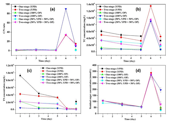 To investigate the effects of carbon/nitrogen source and sugar concentration on yeast cell growth and lipid accumulation in Lipomyces starkeyi, the C/N ratio, TC concentration, TN concentration, and residual sugar concentration in each flask were monitored. Figure 5a displays the changes of the C/N ratios along with production of yeast cells and lipids. From day 1 to day 5, no significant difference (p values > 0.05) in the C/N ratios among different flasks was observed. The relatively stable C/N ratios indicated that the carbon source and the nitrogen source were consumed in a relatively consistent pace between day 1 and day 5. The dynamic changes of TC and TN concentrations shown in Figure 5b,c also supported the above-mentioned results. In the meantime, the sugar concentration decreased from 103.83 ± 7.24 to 55.79 ± 1.68 mmol/L due to consumption by cells. After cell collection and re-suspension, the second-stage flasks showed the higher C/N ratios (Figure 5a), which was attributed to the nitrogen limitation of new sugar solution in the second-stage flasks (Figure 5b–d). After one day fermentation, the carbon source was significantly (p values < 0.05) consumed by the yeasts for lipid accumulation at the second-stage flasks, which was consistent with the relatively larger internal lipid droplets (Figure 2d and Figure 4d). It has been found that, yeast cells only entered a lipid accumulation phase when the available nitrogen concentration was sufficiently low [36]. By harvesting the cells at day 6 and re-suspending the cells in a nitrogen-limited sugar solution, the cells entered a lipid accumulation phase by consuming extra sugar, leading to a higher lipid content (see Section 3.3). Moreover, two-stage flasks with different media showed diversified C/N ratios, TC concentration, and TN concentration, but with similar changing tendency. The results further demonstrated that the two-stage fermentation method was of great potential in lipid production by Lipomyces starkeyi.