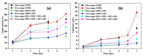Figure 6 shows the lipid content and lipid titer in different flasks. In general, the lipid contents and lipid titer in all the flasks showed a continuously increasing tendency, indicating that the cell growth and lipid biosynthesis kept active throughout the entire fermentation process. Specifically, at day 1, the lipid contents in flasks with YPD, 100% OP, and 50% YPD + 50% OP were 9.8–12.3, 9.4–10.5, 8.5–9.3, respectively. After 4 days of fermentation, these values increased to 45.13–47.8, 19.1–20.3, and 29.3–30.0, respectively. Furthermore, these values increased to 52.0–61.6, 21.34–27.13, and 38.18–46.35, respectively, at the end of the fermentation. More specifically, at day 7, the lipid contents in two-stage flasks with YPD, 100% OP, and 50% YPD + 50% OP were 18.5%, 27.1%, and 21.4% higher than those of the corresponding one-stage fermentation. The relatively higher lipid contents in two-stage fermentation were consistent with the relatively larger internal lipid droplets of the yeast cells in the second-stage flasks (Figure 2d and Figure 4d). It has been reported that the adaptation of the yeast to the hemicellulosic hydrolysate contributed to better fermentation performance with no lag phase [37]. Hence, in order to enhance the yeast fermentation using OP medium, the adaptation approach deserves to be incorporated into the two-stage fermentation in future studies.