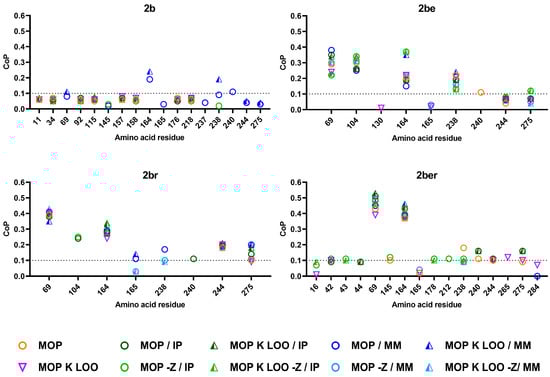 Positions 69, 104, and 164 were the most relevant position independent of the applied modelling, both for the 2be and 2br phenotypes. Position 238 was stronger associated with 2be. When the MM was considered, position 238 but also 165 showed CoP values above the threshold. Position 240 was only weakly allocated to both 2be and 2br phenotypes, while positions 244 and 275 were predominantly more strongly associated with the 2br phenotype. When the IP was considered and the deletions were ignored, position 275 was also slightly related to 2be, indicating that the charge and relative allocation in the protein structure of this residue plays a role.