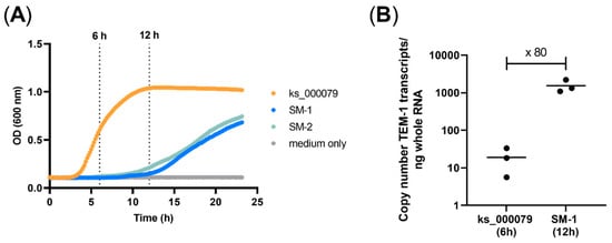 Characteristics of the expression E. coli model SM-1 compared to the clinical E. coli isolate ks_000079. (A) Comparison of the growth curves, (B) quantification of TEM-1 transcripts.