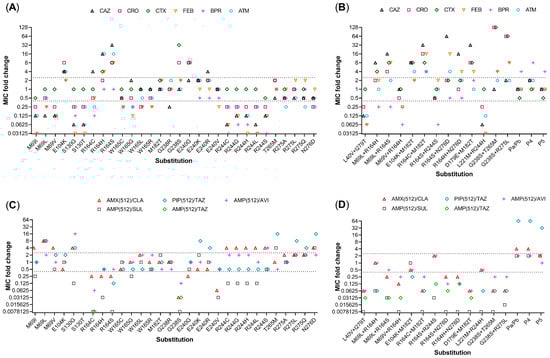 Changes in MIC of single mutants (A,C) and double mutants (B,D) compared to the parenteral strains (SM-1, or SM-2 for promotor mutants) against (A,B) cephalosporins and aztreonam, or for (C,D) penicillin/BLI combinations. Mutant S130T that was sensitive to all tested penicillins, therefore the penicillin/inhibitor combinations could not be determined. Some mutants were sensitive for PIP, therefore TAZ was combined with AMP.