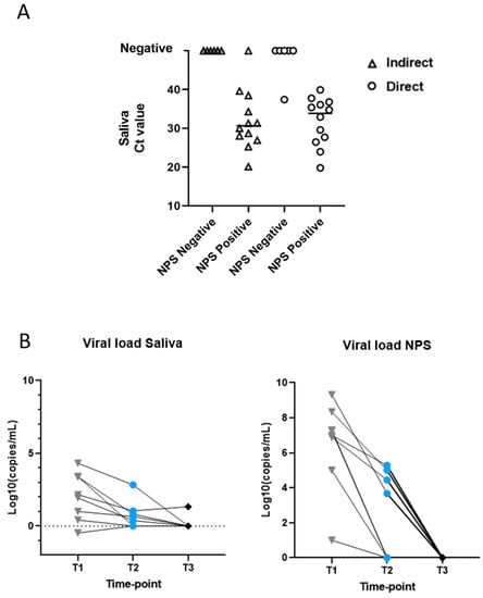 SARS-CoV-2 genomic RNA detection in saliva and NPS of 8 health care workers (HCWs) resulted positive after full vaccination. Dots represent data obtained from individual subjects (HCW n. 1–8) at the following time points: T1, 1–2 days after diagnosis; T2, 7–10 days after diagnosis; T3, 10–15 days after diagnosis. (A) Ct results of RT-PCR in saliva by indirect and direct approaches vs. NPS tested positive or negative for SARS-CoV-2 infection. For representation purposes, the undetected amplification of negative results in saliva is reported with Ct > 40. (B) Analysis of viral load variation during infection using ddPCR in NPS and saliva. Each line corresponds to individual HCWs’ viral load variation. Gray triangles correspond to the viral load at T1, blue dots to T2, and black rhombuses to T3. Data are represented as Log10copies/mL. For undetected viral load, value is reported equal to 0.