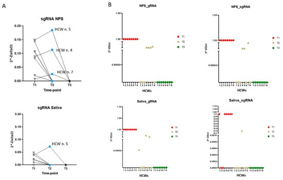 Subgenomic viral RNA analysis in saliva and NPS of 8 health care workers (HCWs) that resulted positive after full vaccination. Dots represent data obtained from individual subjects (HCW n. 1–8) at the following time points: T1, 1–2 days after diagnosis; T2, 7–10 days after diagnosis; T3, 10–15 days after diagnosis. (A) Subgenomic viral RNA (sgRNA) in relation to genomic viral RNA (gRNA). Data are expressed as 2−∆Ct (sgRNA Ct–gRNA Ct). (B) Subgenomic (sg) and genomic (g) viral RNA analysed individually in relation to RNaseP (human internal amplification control). Data are expressed as 2∆∆Ct (T2 or T3 (gRNA–RNaseP), T1 (gRNA–RnaseP) for the analysis of genomic RNA, and T2 or T3 (sgRNA–RNaseP), T1 (sgRNA–RnaseP) for the analysis of subgenomic RNA).