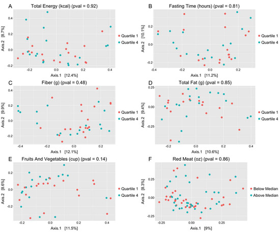 There was no evidence of significant clustering on beta diversity analyses by Bray–Curtis dissimilarity (PERMANOVA) of lowest and highest quartiles of short-term dietary intake measures: (A) total energy; (B) fasting time; (C) fiber; (D) total fat; (E) fruits and vegetables; (F) red meat (red meat categorized as above or below median). Unadjusted p-values are shown.