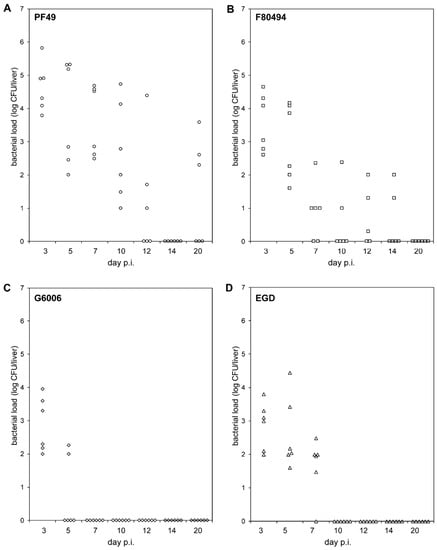 The two 4b strains, PF49 and F80594, showed different bacterial load patterns in the liver than strain G6006 and EGD (Figure 1, Table S1).