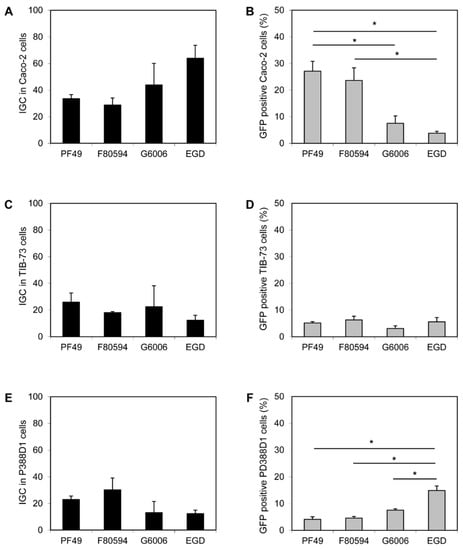 No difference in the invasion efficiency of all four strains (PF49, F80594, G6006, and EGD) was observed in Caco-2 and TIB-73 cells. Furthermore, the uptake of all strains by macrophage-like P388-D1 cells was equal (data not shown). In Caco-2 a higher intracellular proliferation (calculated as IGC) of strain G6006 and EGD was observed compared to strain PF49 and F80594; however, the effect was not statistically significant (Figure 2A). In contrast, a significantly higher number of GFP-positive Caco-2 cells were observed after infection with strain PF49 and F80594 (37.1 and 23.6%) compared to strain G6006 and EGD (7.5 and 3.8%, Figure 2B). In TIB-73 cells, no differences between the strains were observed for intracellular growth and cell-to-cell spread (Figure 2C,D). In macrophage-like P388D1 cells, the IGC was lower for strain G6006 and EGD than for strain PF49 and F80594. However, the differences were only small and not significant. In contrast, an increased cell-to-cell spread was observed for strain EGD compared to the epidemic strains (Figure 2E,F).