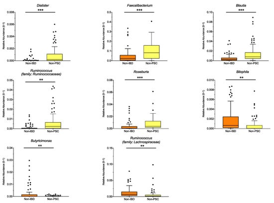 - Vieira-Silva, S.; Sabino, J.; Valles-Colomer, M.; Falony, G.; Kathagen, G.; Caenepeel, C.; Cleynen, I.; van der Merwe, S.; Vermeire, S.; Raes, J. Quantitative microbiome profiling disentangles inflammation- and bile duct obstruction-associated microbiota alterations across PSC/IBD diagnoses. Nat. Microbiol. 2019, 4, 1826–1831. [Google Scholar] [CrossRef]